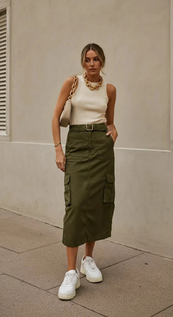 A simple white tank top creates a clean base that allows the olive cargo skirt to stand out. The overall look feels relaxed yet put-together when paired with casual sneakers and minimal accessories, making it ideal for everyday outings.