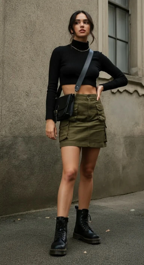 A cropped black turtleneck brings a sharp contrast to a khaki mini cargo skirt, giving the outfit a bold city feel. Combat boots and a compact crossbody bag enhance the practical and edgy appearance, suitable for casual urban activities.