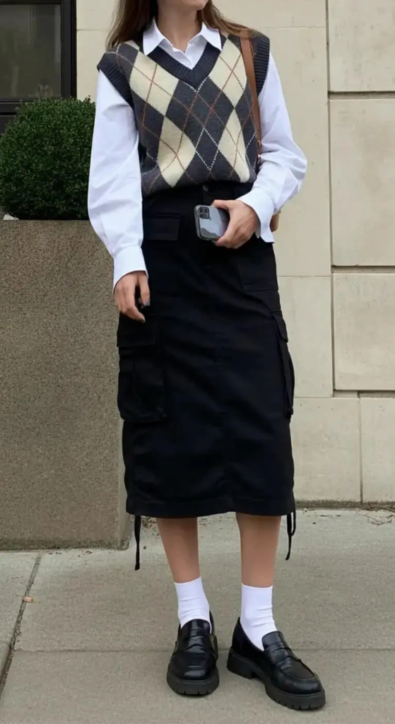A sweater vest layered over a button-up shirt adds a preppy touch to a cargo pencil skirt. Classic loafers complete the look, making it suitable for work environments or academic settings.