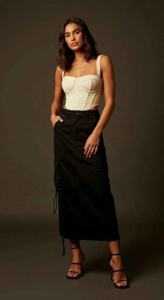 A structured corset top contrasts sharply with the relaxed shape of a cargo maxi skirt. Minimal styling and elegant heels make this outfit suitable for formal dinners or special occasions.