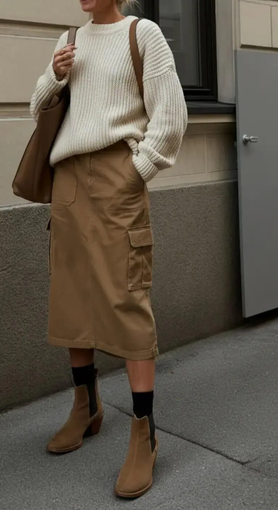 A chunky sweater balances comfort with structure when paired with a cargo midi skirt. Practical footwear and a structured bag keep the look polished and wearable for daily routines.