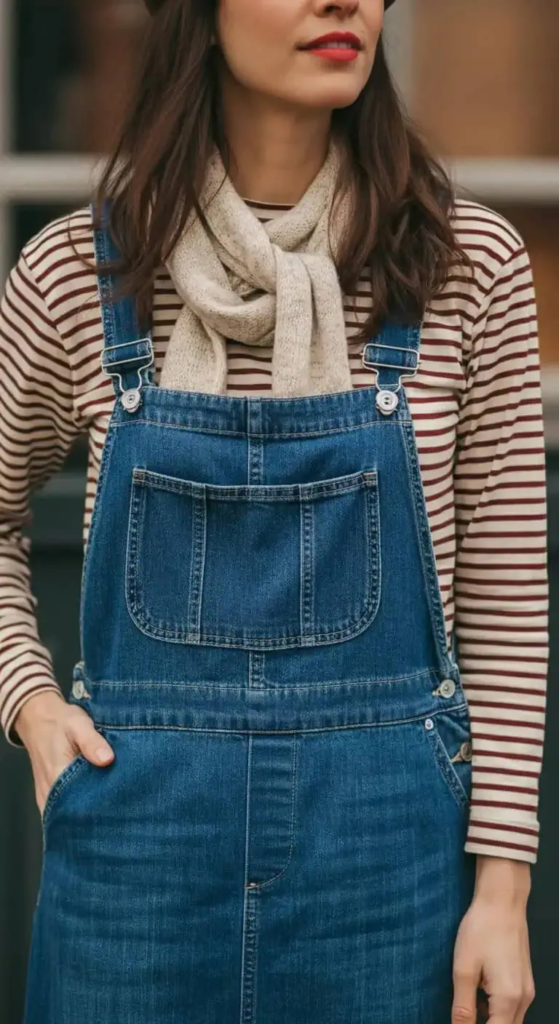 This outfit showcases a timeless casual pairing. The denim pinafore dress offers structure and durability, while the striped t-shirt adds a simple and familiar element. The look feels youthful and comfortable, making it suitable for everyday summer wear. It reflects an easy approach to styling that remains consistently appealing.