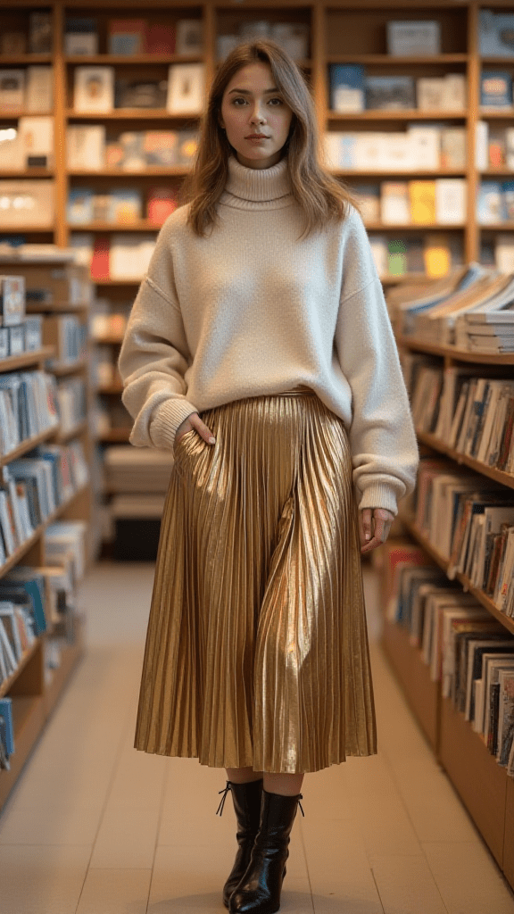 A metallic pleated midi skirt exudes festive energy. Pair with a cozy cream turtleneck and pointy-toe ankle boots for balance.