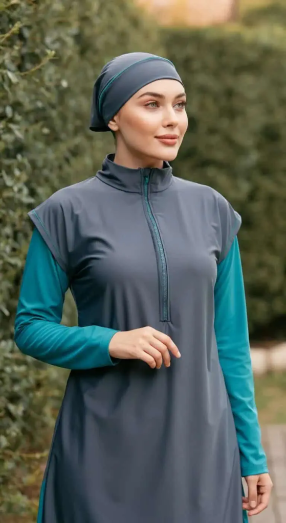 An attached hood drapes neatly, adding both function and elegance. The chlorine-resistant fabric ensures durability for regular pool use, so it remains reliable over time. This look proves that full coverage swimwear can feel modern and flattering without sacrificing practicality.