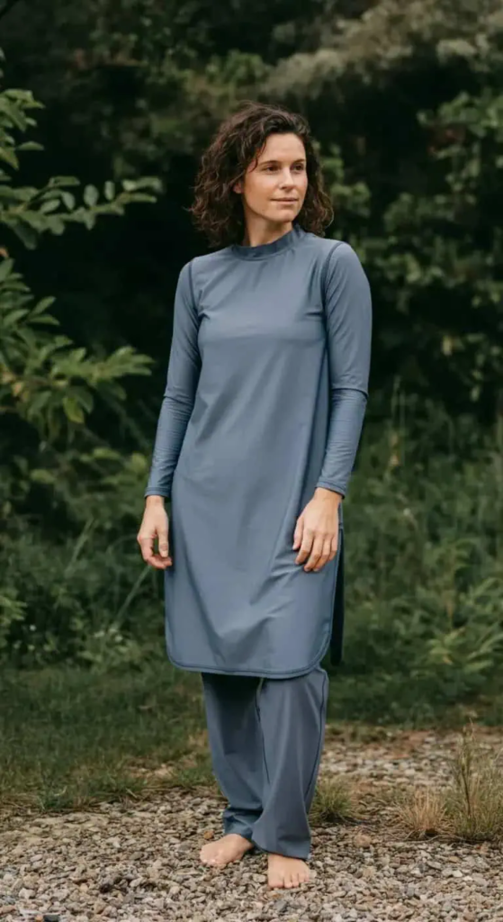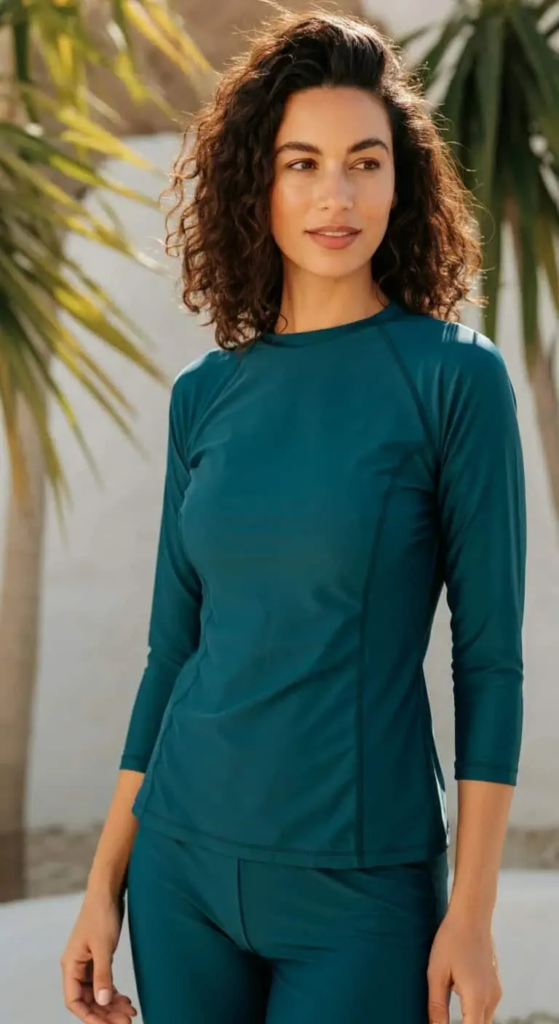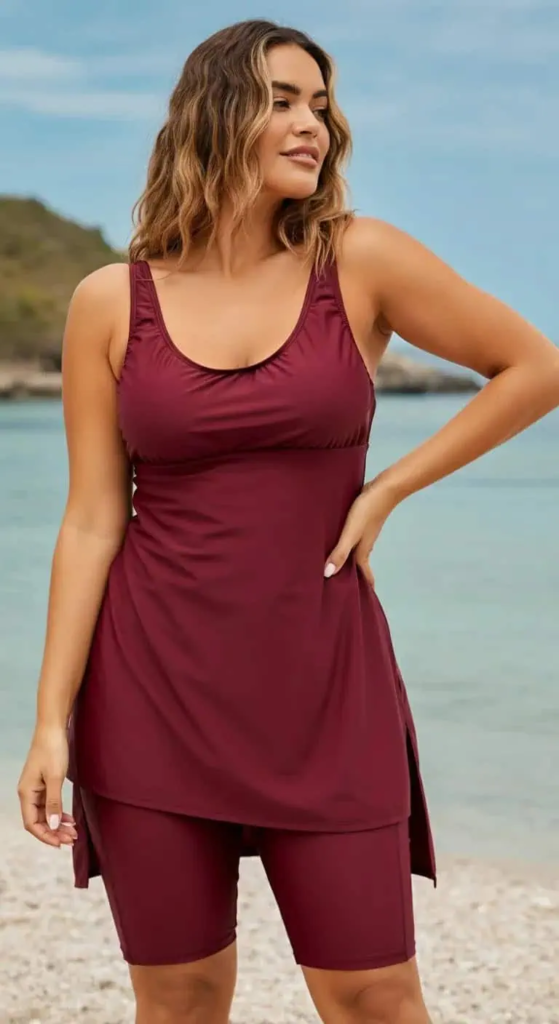 A swim dress paired with full-length leggings offers one of the most complete coverage options while still feeling feminine. The knee-length cut gives it the appearance of a casual summer dress, while the fitted leggings underneath ensure confidence during movement.