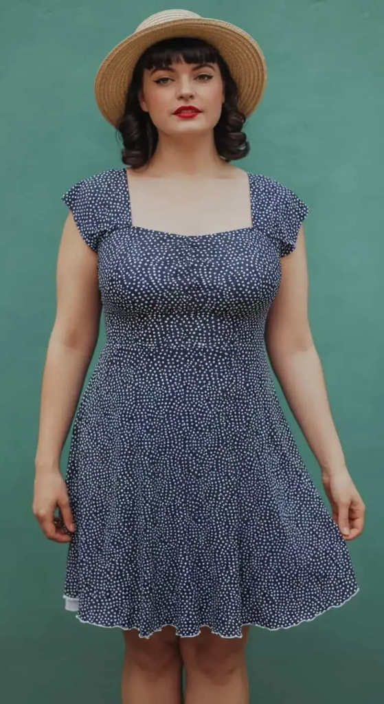 The ruched bodice shapes the figure gently, adding definition without tightness. Matching swim shorts underneath provide reassurance while swimming. It’s perfect for those who appreciate vintage style with modest detailing.