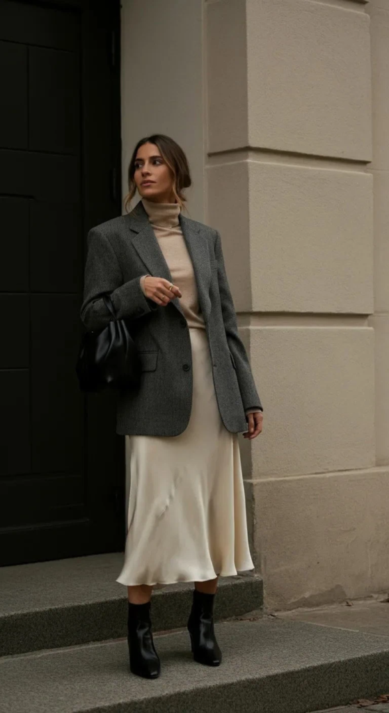 Pair with a flowing ivory silk midi skirt for graceful movement, and layer with a fitted cream cashmere turtleneck. Black leather knee-high boots and a structured bag complete the look. Ideal for autumn events, gallery openings, or stylish city strolls.