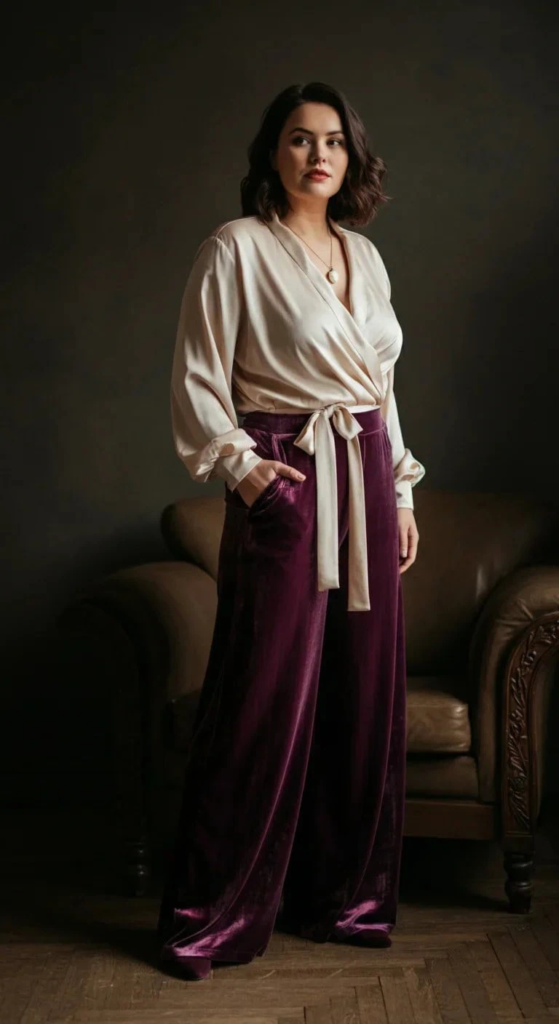 The silk wrap top adds another layer of sophistication to the outfit. Its gentle draping helps define the waist while maintaining a soft and elegant look. The cream tone also complements the richness of velvet beautifully.