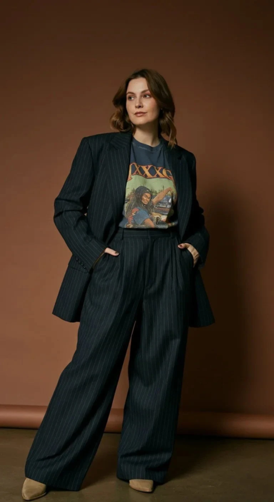 A pinstripe suit paired with a graphic tee offers a modern update to traditional tailoring. Instead of following strict formal styling rules, this combination blends professionalism with personality.