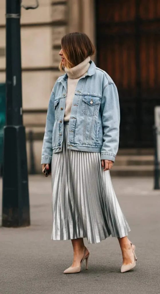 Combining a metallic pleated skirt with a denim jacket creates an outfit that mixes glamour with casual style. The shine of the metallic fabric adds excitement and energy to the look.