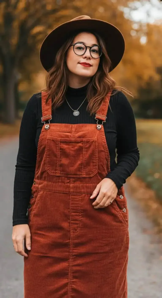 A corduroy overall dress paired with a fitted turtleneck creates a playful yet comfortable outfit. The textured fabric of corduroy adds warmth and visual interest.