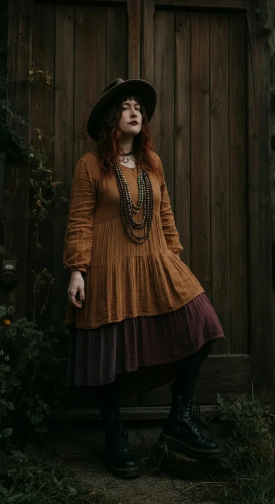 Create an ethereal, nature-inspired look by layering natural fabrics in earth tones. Mix textures like linen, cotton, and velvet to add depth, and accessorize with vintage-inspired jewelry and sturdy boots.