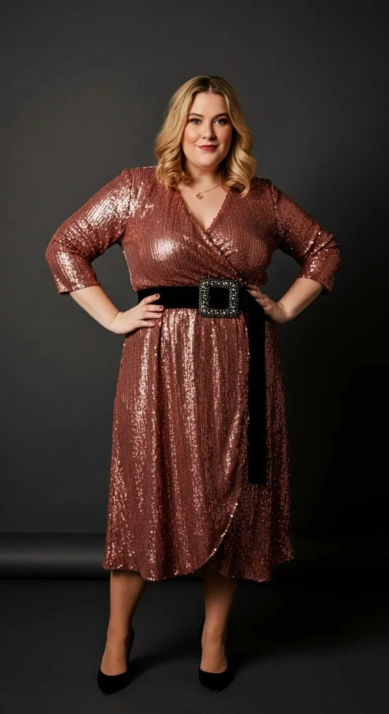 A rose gold sequin wrap dress is a great option for creating a flattering hourglass silhouette. The wrap style naturally highlights the waist while offering flexibility and comfort, which is perfect for a night of dancing and socializing. The shimmering sequins catch the light from every angle, making the outfit feel glamorous without requiring too many additional accessories.