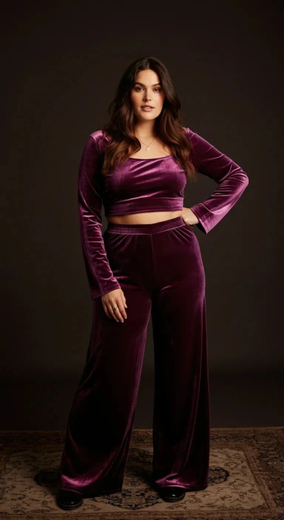 A velvet coord set in deep purple brings luxury and softness to a club outfit. Velvet naturally reflects light in a subtle way, giving the outfit depth and richness without looking overly flashy.