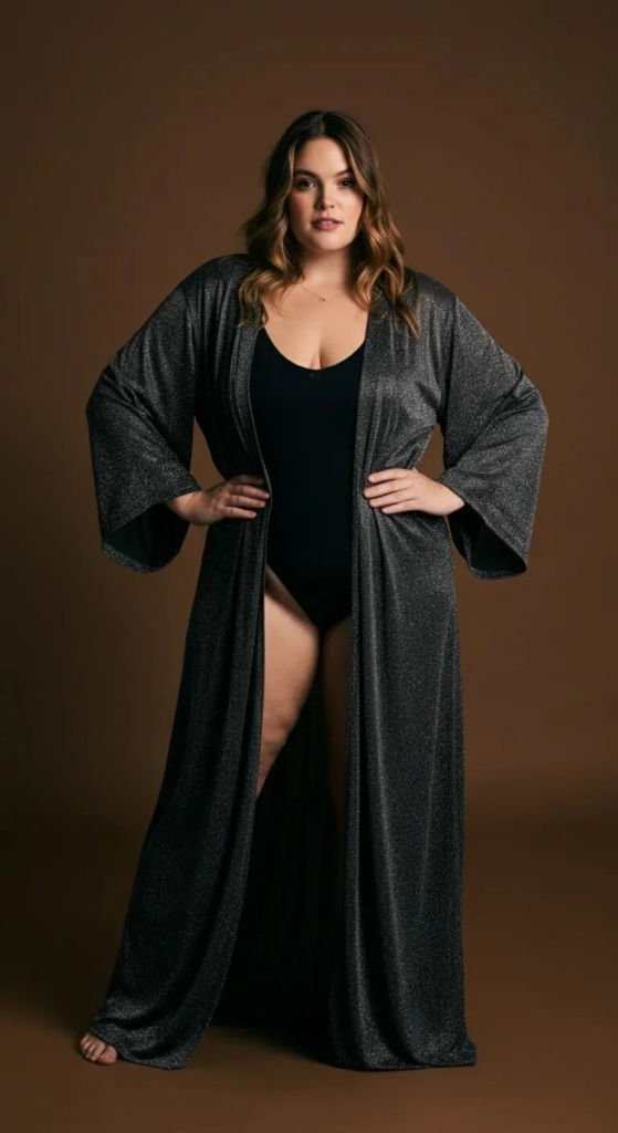A glitter maxi kimono adds dramatic movement and sparkle to a club look. As you walk or dance, the flowing fabric creates beautiful motion that naturally draws attention.