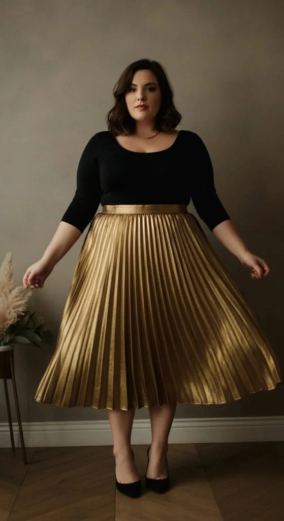 A metallic pleated skirt creates beautiful movement as you walk or dance. The pleats add texture while the metallic finish reflects light dramatically.