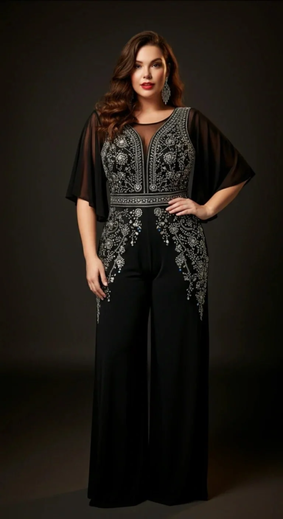 A black jumpsuit decorated with crystal embellishments creates a stunning and glamorous appearance. The sparkle adds detail without requiring too many additional accessories.
