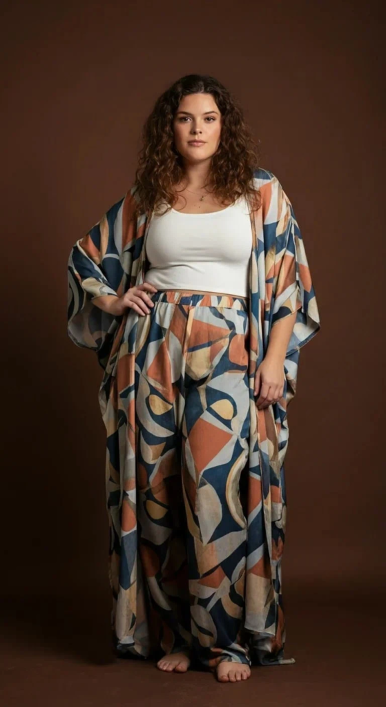 High-waisted black pants help maintain a balanced silhouette. They provide comfort and keep the look sleek while letting the kimono shine as the focal point.