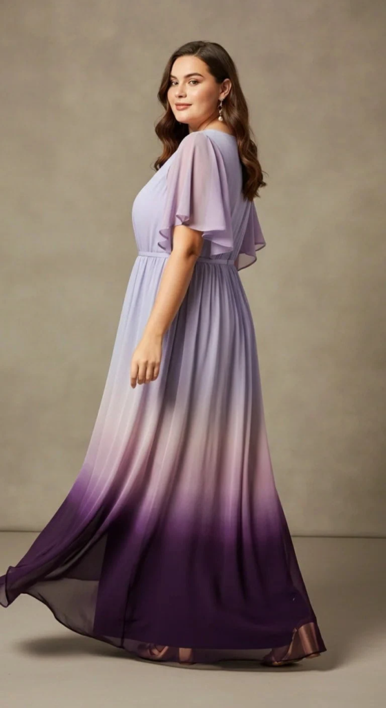 Layers of flowing chiffon create movement and ethereal charm, while the gradient purple ombré adds visual interest and depth.