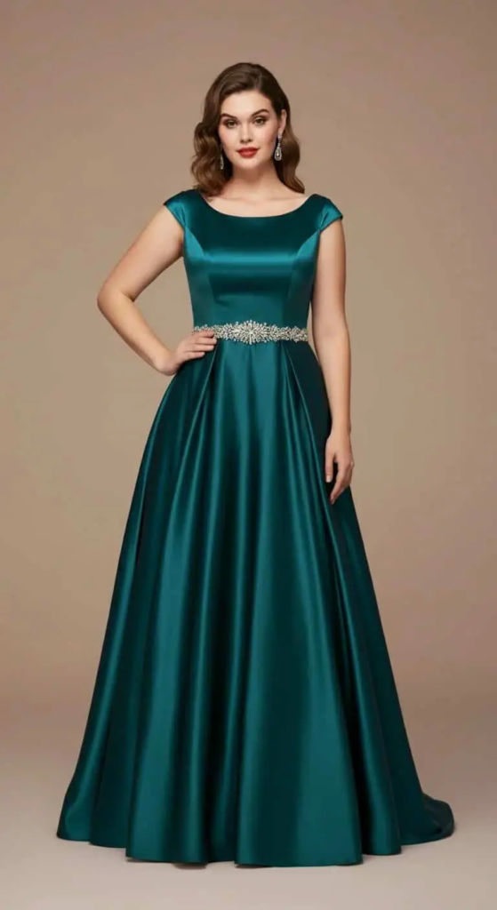 The fitted silhouette with slight stretch provides comfort and style for plus-size women. Minimal accessories are recommended to highlight the gown’s luxurious fabric and intricate detailing.