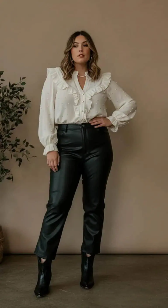 High-rise leather pants are flattering for plus-size figures, hugging curves without restricting movement. Pair with a white ruffled blouse featuring pearl snap buttons for a touch of femininity and classic western detailing.