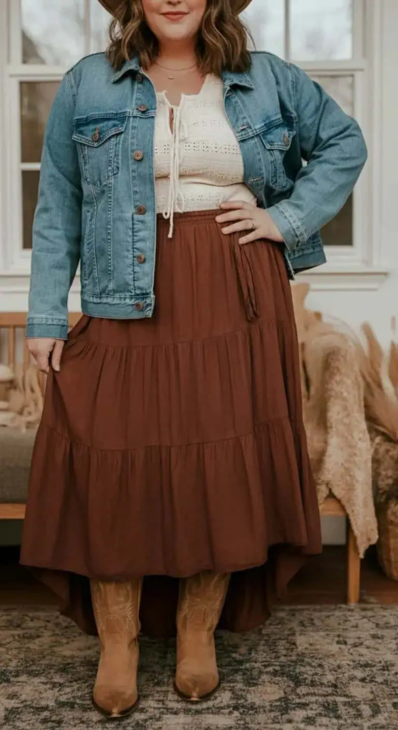 A flowing tiered prairie skirt in warm earth tones creates movement and comfort, ideal for plus-size figures who want breathable clothing with flair. Pair with a fitted denim jacket and a white peasant blouse to balance the outfit and maintain a polished silhouette.