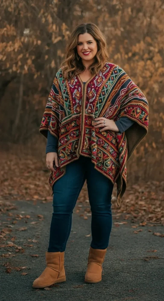 A geometric-patterned poncho with fringe details serves as a statement piece while providing warmth and coverage. Pair with dark wash fitted jeans that flatter curves and maintain proportion.