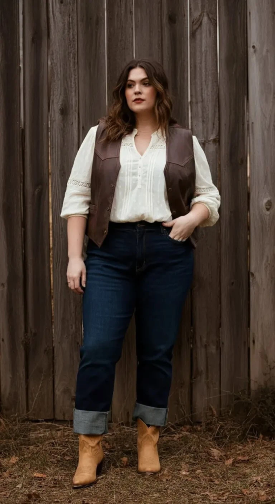 Layer a fitted leather vest over a flowing prairie blouse to combine structure with movement. Dark wash jeans maintain balance and ensure a flattering fit for plus-size figures.