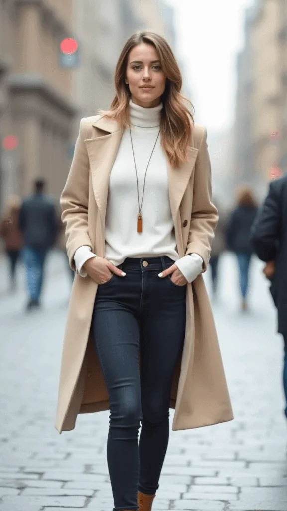 This outfit is proof that winter warmth and a polished appearance can coexist. A fitted turtleneck acts as a reliable base layer, keeping your neck and upper body protected from the cold while creating a clean, streamlined look. Its simplicity allows other pieces to stand out without feeling overwhelming.