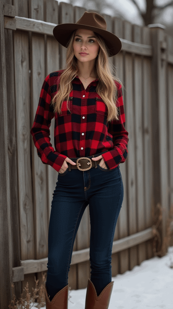 This outfit brings a timeless appeal to winter denim styling. A plaid shirt adds warmth and visual texture, making it ideal for colder weather.