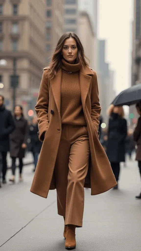 Monochrome outfits are a winter styling secret. Sticking to one color family creates a clean, cohesive look that appears elevated and thoughtful. Camel tones are especially flattering in winter, offering warmth and sophistication while standing out subtly against gray city backdrops.