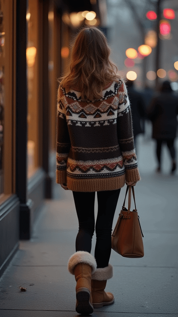 This look is all about comfort without sacrificing style. A Fair Isle sweater adds visual interest and a winter-ready feel, while black leggings keep the outfit streamlined and easy to wear. Fur-lined snow boots provide serious warmth, making them ideal for cold days without looking bulky.