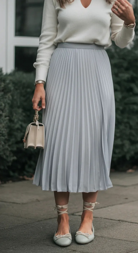 A pleated skirt remains a timeless piece that brings elegance to summer outfits. Choosing a pastel shade keeps the look soft and seasonal, while a white blouse adds freshness and balance. The flowing movement of pleats adds subtle sophistication without feeling overly formal.
