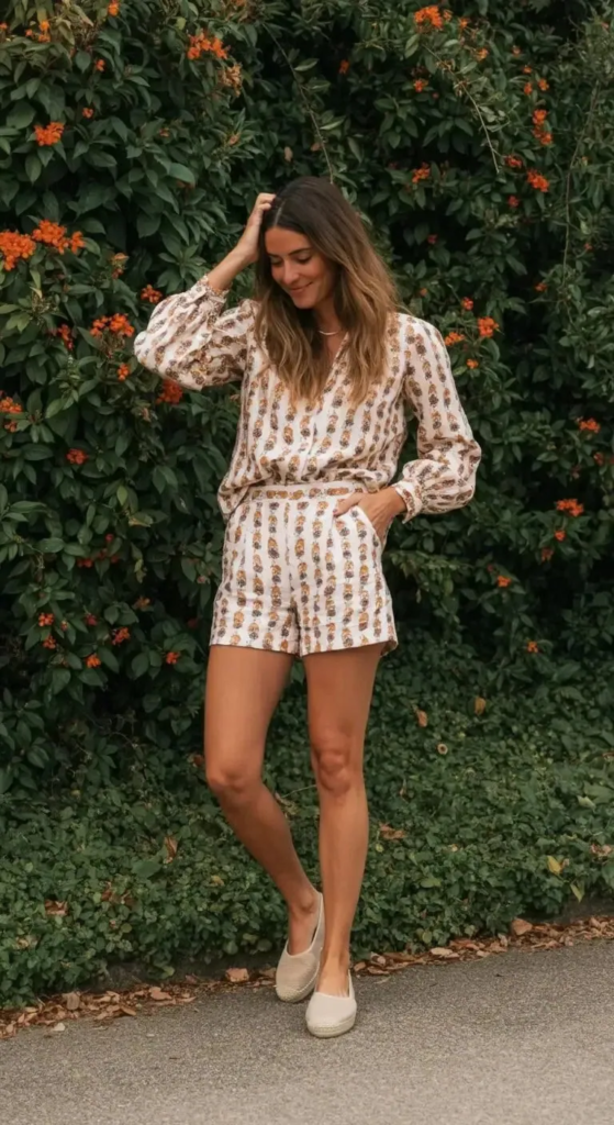Matching co-ord sets offer a stylish solution for effortless dressing. Wearing coordinated shorts and a blouse creates a cohesive look that appears thoughtfully styled without requiring much effort.