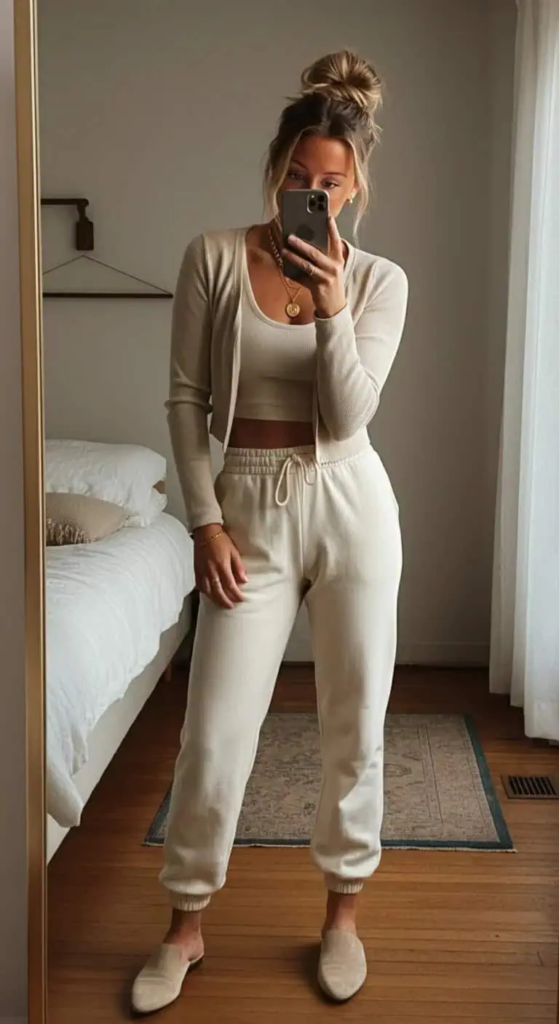 A monochrome cream outfit instantly creates a refined and cohesive appearance. Pairing cream sweatpants with a cropped cardigan in the same tone keeps the look soft, clean, and visually balanced.