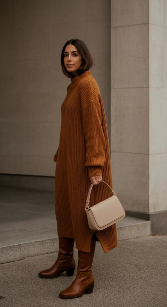 A midi-length sweater dress in a warm caramel tone instantly conveys elegance while remaining incredibly comfortable. The soft knit material drapes naturally, flattering various body types and providing ease of movement—perfect for navigating a busy Thanksgiving day. Pairing this dress with knee-high brown leather boots adds a sophisticated touch, grounding the outfit with structure and balance.