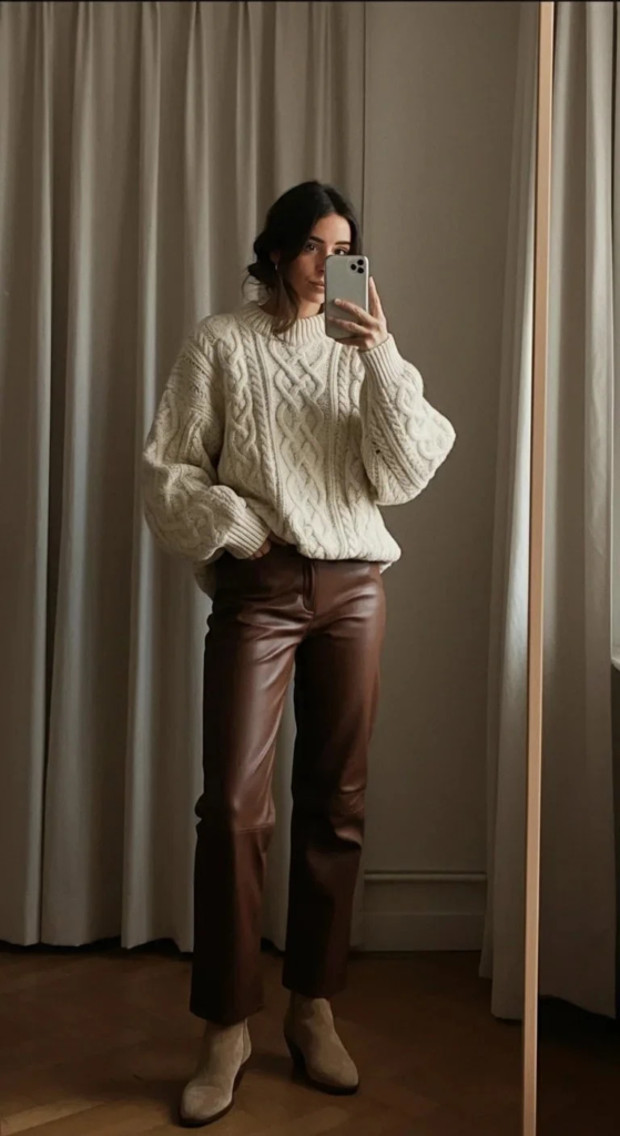 The oversized cream cable-knit sweater is a cozy option that exudes casual charm. Its soft, warm fabric makes it perfect for cooler November temperatures while allowing freedom of movement. Pairing it with brown leather straight-leg pants creates a visually engaging contrast between soft and structured textures, transforming a simple casual look into a fashion-forward ensemble.