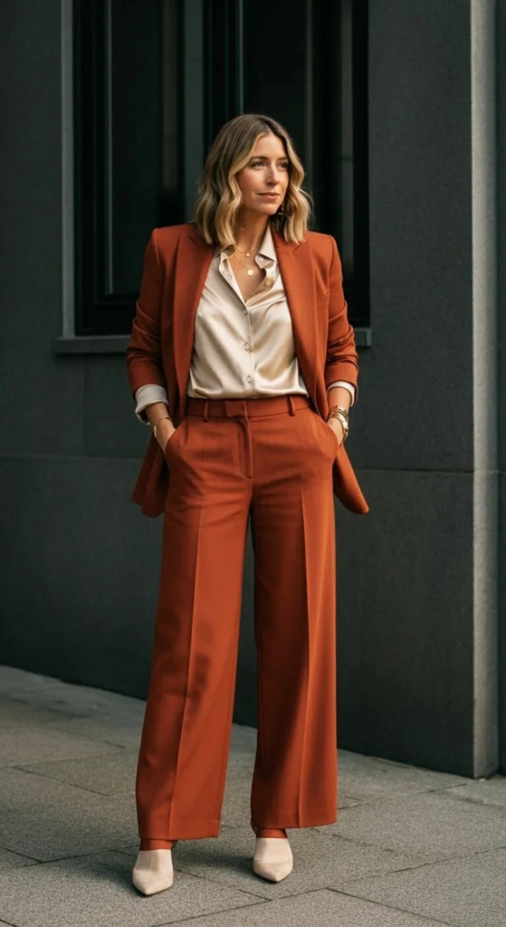 For a statement-making Thanksgiving outfit, a wide-leg rust pant and matching blazer combination exudes confidence and style. The rich autumnal rust color is festive and flattering, making it ideal for family photos or more formal holiday events. Layering a cream silk blouse underneath introduces softness and contrast, balancing the bold monochromatic tone.