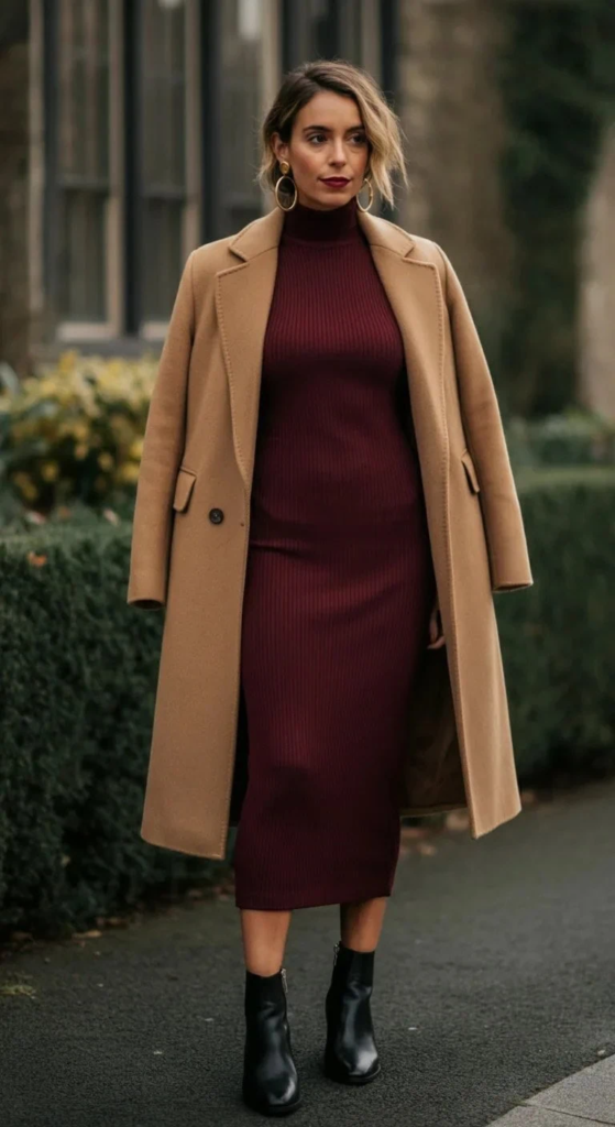 A burgundy ribbed midi dress is a versatile base that flatters the figure and provides a touch of festive color. Layering with a camel wool coat adds warmth, drama, and a chic edge to the silhouette. Black ankle boots enhance the refined look while grounding the ensemble for a comfortable fit.