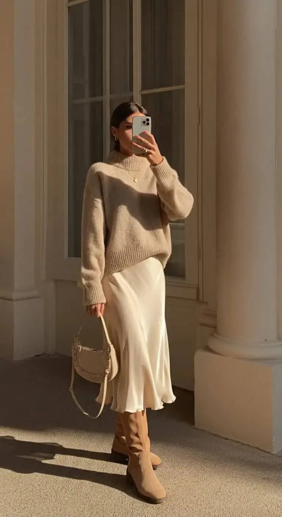 Beige and cream tonal layering creates a cohesive, elongating effect. A beige cashmere sweater paired with a cream slip skirt results in a streamlined silhouette. Tan knee-high boots continue the color harmony, while delicate jewelry adds subtle sparkle.