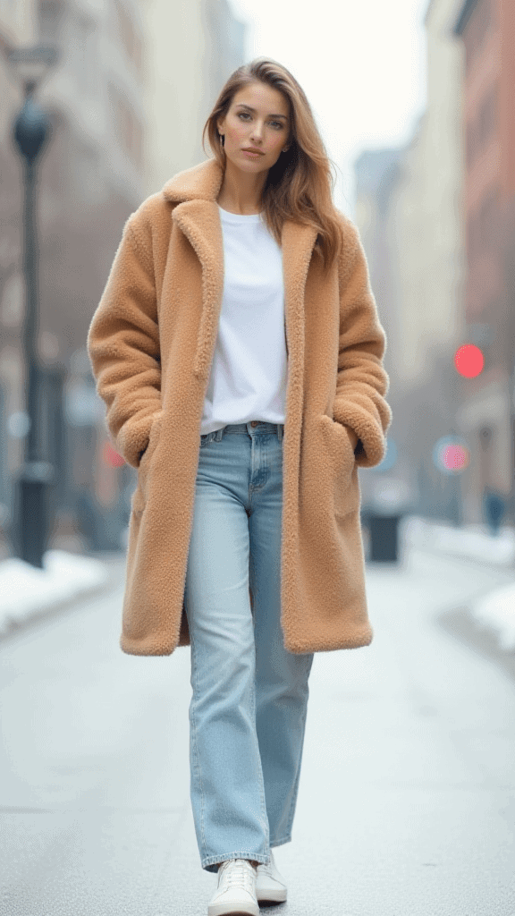 Embrace your inner teddy bear with this cozy-chic look. The teddy coat is basically a hug you can wear, while straight-leg jeans keep things casual and cool.