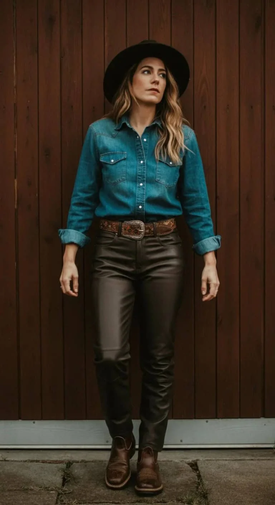 Pairing it with sleek leather pants updates the look dramatically. Sturdy yet stylish work boots maintain practicality, while a tooled leather belt adds detail and authenticity without overwhelming the outfit.