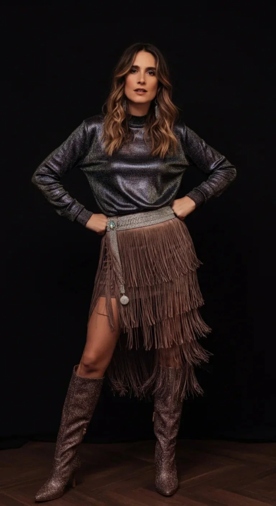 A black suede fringe skirt adds texture and movement. Decorative western boots reinforce the theme, and a belt with crystal embellishments introduces extra detail for special occasions.