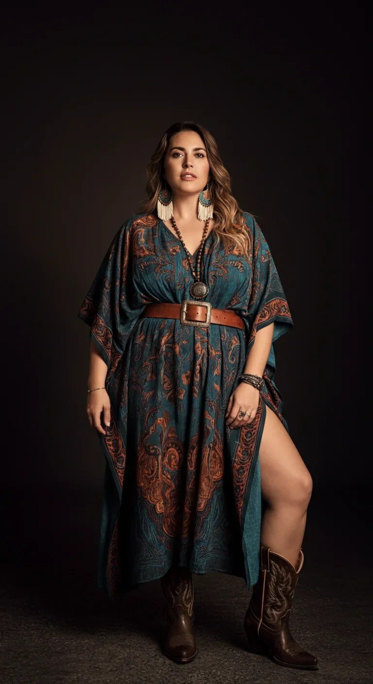 Cinch it at the waist with a tooled leather belt to add structure and western detail. Neutral boots keep the look grounded, and statement turquoise earrings bring color and character to finish the ensemble.