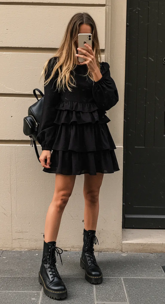 Ruffles soften the look, while combat boots add strength and attitude. This contrast makes the outfit feel modern and playful.