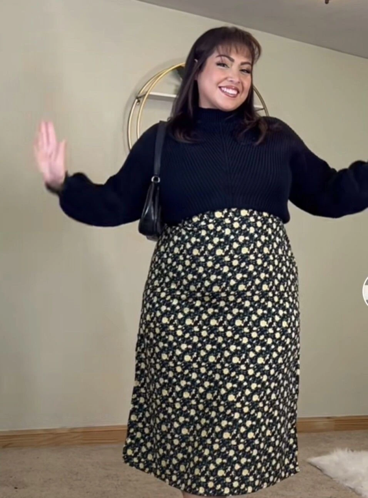 This look relies on contrast and flow. The fitted ribbed top provides structure. The maxi skirt introduces movement and elegance. Together, they create dimension and elongation. Dark tones ground the outfit’s visual weight. Floral details soften the overall feel. The styling balances comfort with sophistication.