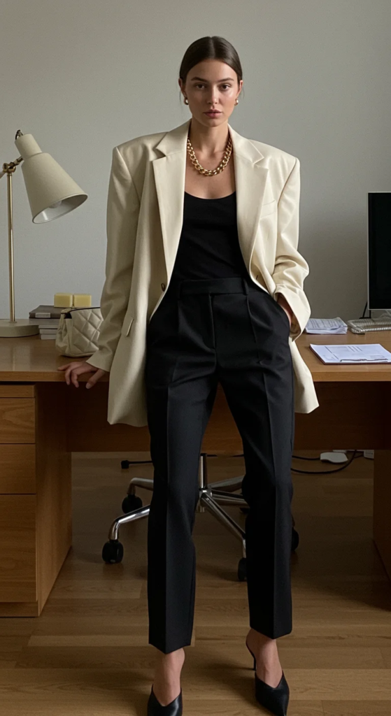 An oversized cream blazer adds a contemporary touch to business casual. Layering it over a fitted tank creates contrast between loose and tailored pieces.