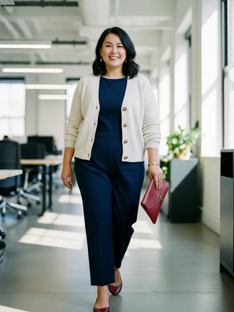 This ensemble feels modern and confident. A textured cardigan adds depth and warmth. A tailored jumpsuit serves as a stylish alternative to traditional separates. Pointed flats elongate the legs while remaining comfortable. A statement cuff bracelet adds a subtle touch of glamour.