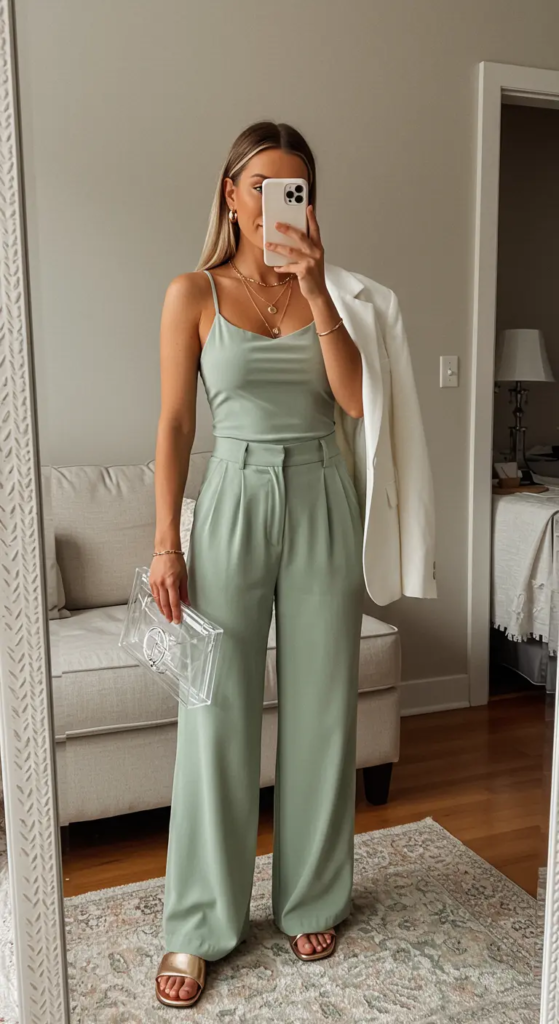A sage green tank top and wide-leg pants set offers a clean monochrome look.