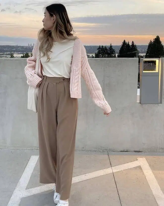Cozy Chic: Pastel Cardigan and Tailored Trousers